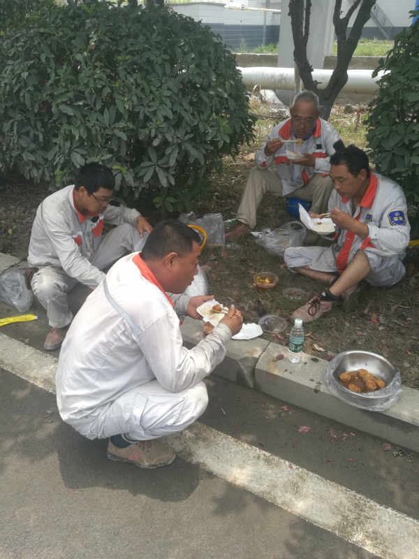 6月28日,在炎炎烈日之中,在地面溫度達(dá)40多度的中午時間,位于池月路富佳攪拌站的環(huán)網(wǎng)柜旁,滿頭大汗的于廣兵、孫忠清、孫正宏、周玉民等顧不上休息,正盤坐在樹蔭下對付著吃著快餐,與接下來的搶修工作爭搶時間。隨后這一畫面被筆者用手機(jī)捕捉下來。筆者相信,這不僅僅是一張堅(jiān)守在一線的工人們高溫下吃飯的照片,更是一張當(dāng)前乃至今后一個時期,臺北供電所員工們在“高質(zhì)發(fā)展、后發(fā)先至”新形勢下“愛企奉獻(xiàn),愛崗敬業(yè)”的真實(shí)寫照。