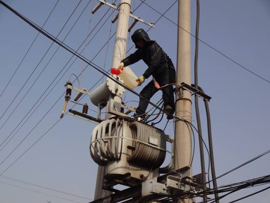 圖為維護人員正在為居民生活區(qū)的變壓器進行加油