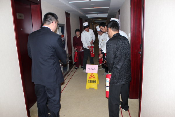 在演練時,在接到報警電話的第一時間內,總經理迅速的趕到消防控制室,統(tǒng)一指揮大家有序進行安全疏散和逃生,客房以及餐廳的員工分頭進行電話和敲門通知并帶領樓層客人用濕毛巾捂住口鼻、彎下身體,依據疏散路線快速、有序地下樓疏散到了大廳。各部門義務消防員在接到火警通知的第一時間內,迅速組織滅火力量趕到起火點,用滅火器對初期火災進行了撲救。整個演練活動緊張有序。