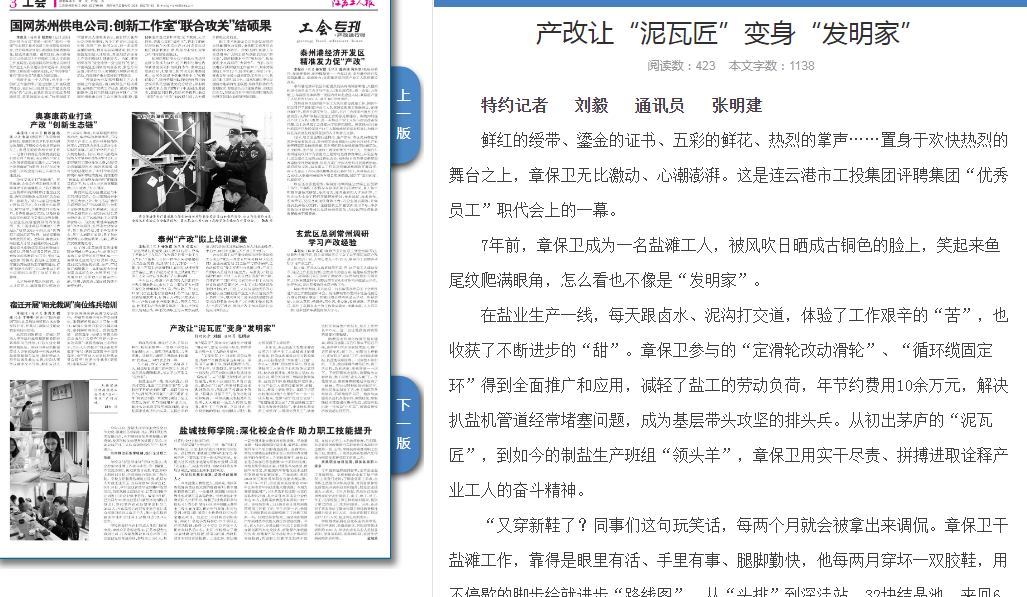近年來,連云港市工投集團灌西公司為打通產業(yè)工人成長成才的身份壁壘、價值體現(xiàn)壁壘及學習教育壁壘,開辦技能培訓“大課堂”,打造“一中心+三基地”職業(yè)教育平臺,即金藍領技術工人培訓中心和技能比武基地、技術創(chuàng)新基地、技能鑒定基地,構建公司、單位和班組三級職業(yè)教育體系、技能培訓體系和技能評定體系,引導產業(yè)工人重在技能深耕、求精、拔尖、攀高上磨練塑造。章保衛(wèi)正是在技能培訓的“大課堂”中一步一步成長起來,他參與的“定時打鹵泵”、“管道輸送加壓法”、“低溫除硫工藝”等技術得到快速推廣,也讓他從普通員工成長為“二星級優(yōu)秀員工”,被推選擔任制鹽生產班組長,每月工資增長800元。這一切讓他獲得滿滿的榮譽感和幸福感。