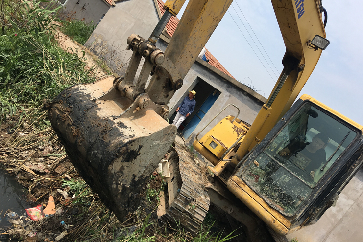 "各項防汛工作中,當(dāng)數(shù)中二圩排水道堵塞問題最為突出,由于之前的燕尾港鎮(zhèn)拆遷,大量拆遷戶涌入灌西鹽場中二圩地區(qū)生活,違建現(xiàn)象嚴(yán)重,各種建筑垃圾和白色垃圾隨處堆放,排水系統(tǒng)深受其害。為方便職工群眾生活起居,灌西公司對中二圩地區(qū)排水道進(jìn)行疏通清理,以便安度汛期。”清理現(xiàn)場,," 防汛辦公室主任楊善兵說道,只見大小挖機(jī)全力施工,對于大挖機(jī)不好進(jìn)入的居民區(qū)內(nèi)部小溝小道則由小挖機(jī)專門清理,對于復(fù)雜地形機(jī)械難以進(jìn)入的地方只能人工清理,務(wù)求做到全面徹底,不留死角。