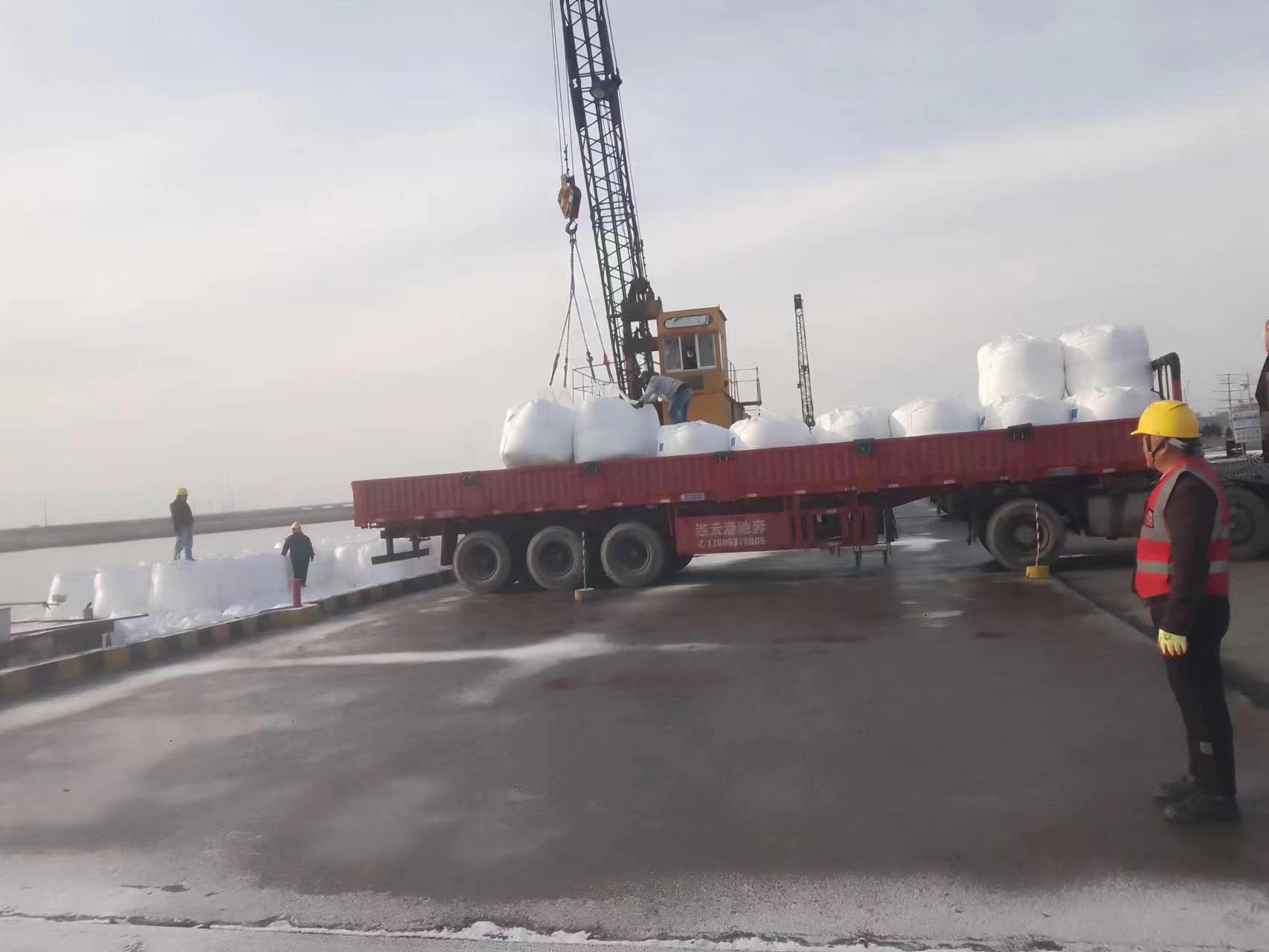 一個(gè)個(gè)白色的大包被吊裝到??吭诖a頭的貨船上,裝卸員工在熱火朝天的忙碌著,從卸船、裝車(chē)、掛鉤、堆碼,每個(gè)環(huán)節(jié)都細(xì)致入微。在碼頭一號(hào)塔吊的作業(yè)現(xiàn)場(chǎng),土方駁運(yùn)也在施工操作,挖掘機(jī)舞動(dòng)長(zhǎng)臂,旋轉(zhuǎn)作業(yè),機(jī)械設(shè)備有序運(yùn)轉(zhuǎn),轟嗚不息,安全員在現(xiàn)場(chǎng)管理,不時(shí)發(fā)出指令作業(yè),做好土方驗(yàn)收的同時(shí),提醒駕駛員在雨雪天氣,注意防滑,安全行駛,為順利完成年度100萬(wàn)噸吞吐量奠定堅(jiān)實(shí)的基礎(chǔ),同時(shí)夯實(shí)來(lái)年碼頭高質(zhì)高效生產(chǎn)。(胡秀同)