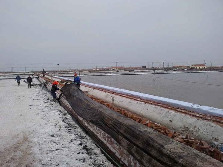 新河制鹽分公司為了盡快改善食用鹽基地面貌,減少池埝上固化紅磚風(fēng)化,沙塵落入鹽池內(nèi),對(duì)池鹽的污染,近期組織分公司職工,對(duì)基地塑池的紅磚固化池埝進(jìn)行處理,先用黑塑布把池埝重包一遍,然后再用土工布苫好。有效地減少了雜物落入池鹽中,為產(chǎn)合格食用鹽提供了良好生產(chǎn)環(huán)境。(圖為職工們正在苫蓋紅磚固化池埝。) (唐廣付)