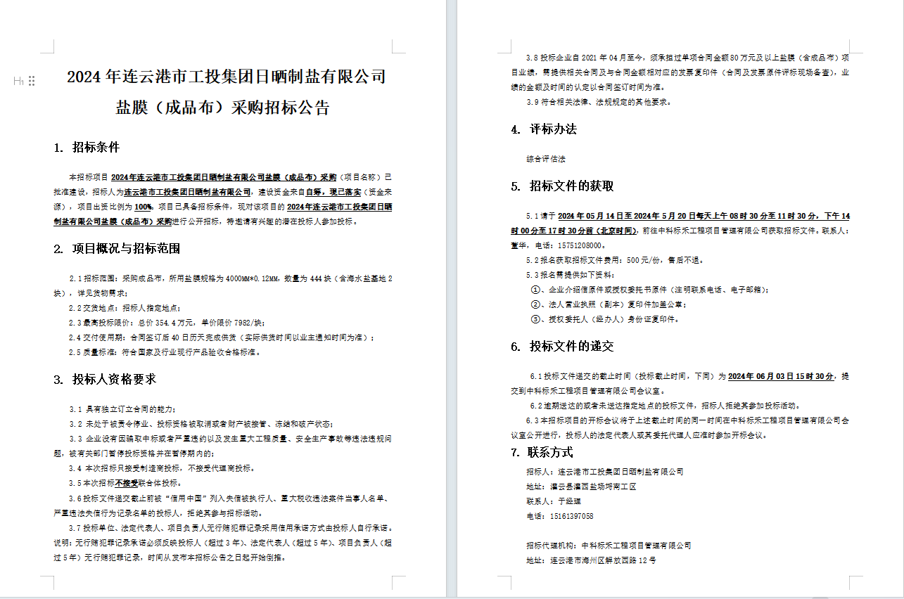 2024年連云港市工投集團日曬制鹽有限公司鹽膜(成品布)采購招標(biāo)公告