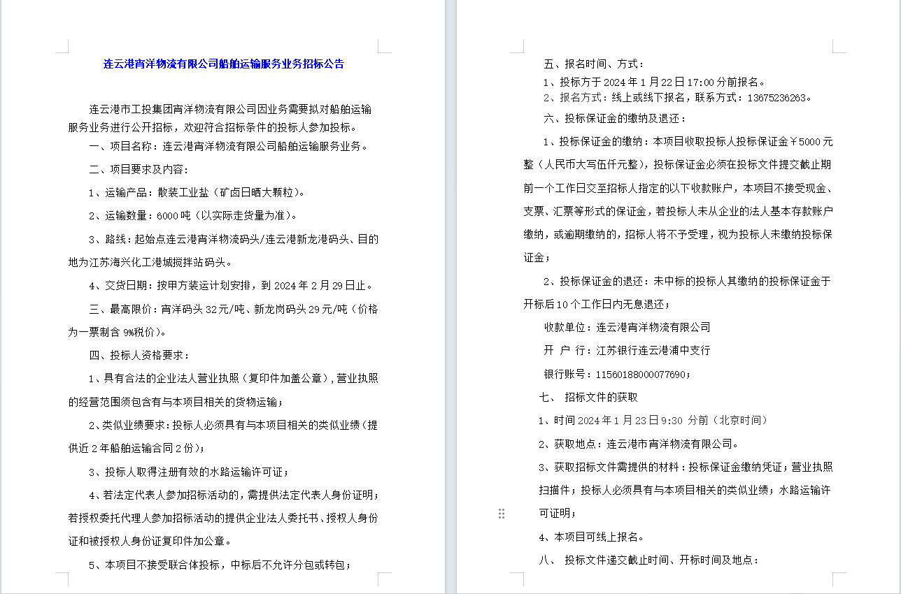 連云港宵洋物流有限公司船舶運輸服務(wù)業(yè)務(wù)招標(biāo)公告