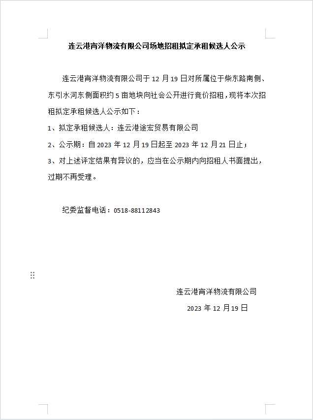 連云港宵洋物流有限公司場地招租擬定承租候選人公示