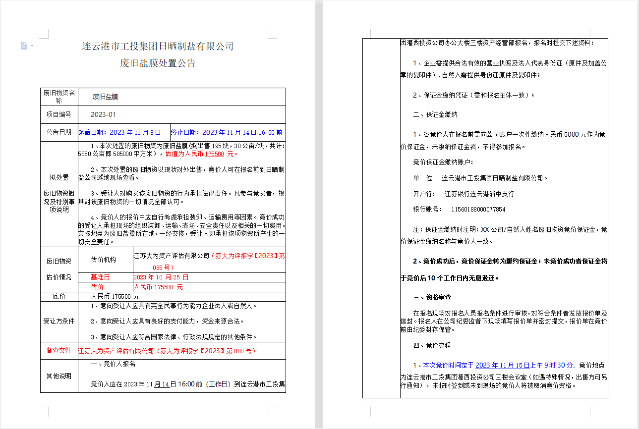 連云港市工投集團(tuán)日曬制鹽有限公司廢舊鹽膜處置公告