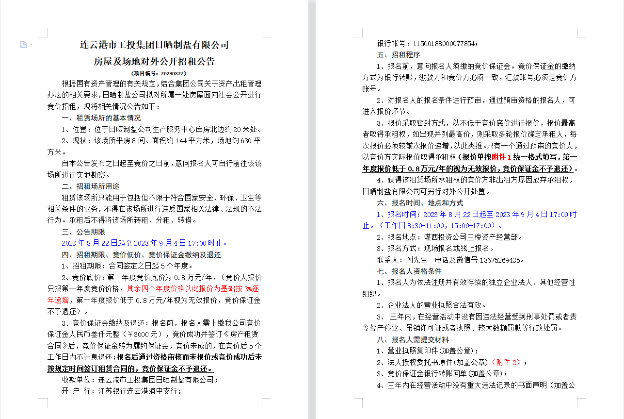 連云港市工投集團(tuán)日曬制鹽有限公司 房屋及場(chǎng)地對(duì)外公開招租公告
