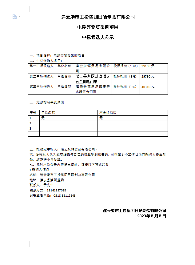 連云港市工投集團(tuán)日曬制鹽有限公司電纜等物資采購(gòu)項(xiàng)目中標(biāo)候選人公示