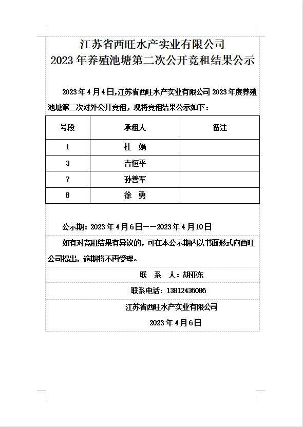 江蘇省西旺水產(chǎn)實(shí)業(yè)有限公司2023年養(yǎng)殖池塘第二次公開(kāi)競(jìng)租結(jié)果公示