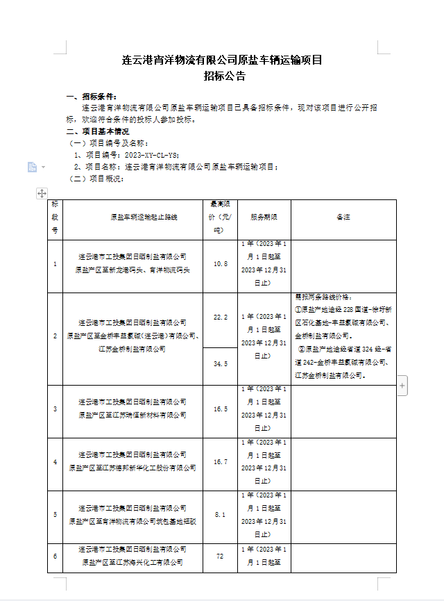 連云港宵洋物流有限公司原鹽車輛運(yùn)輸項(xiàng)目招標(biāo)公告