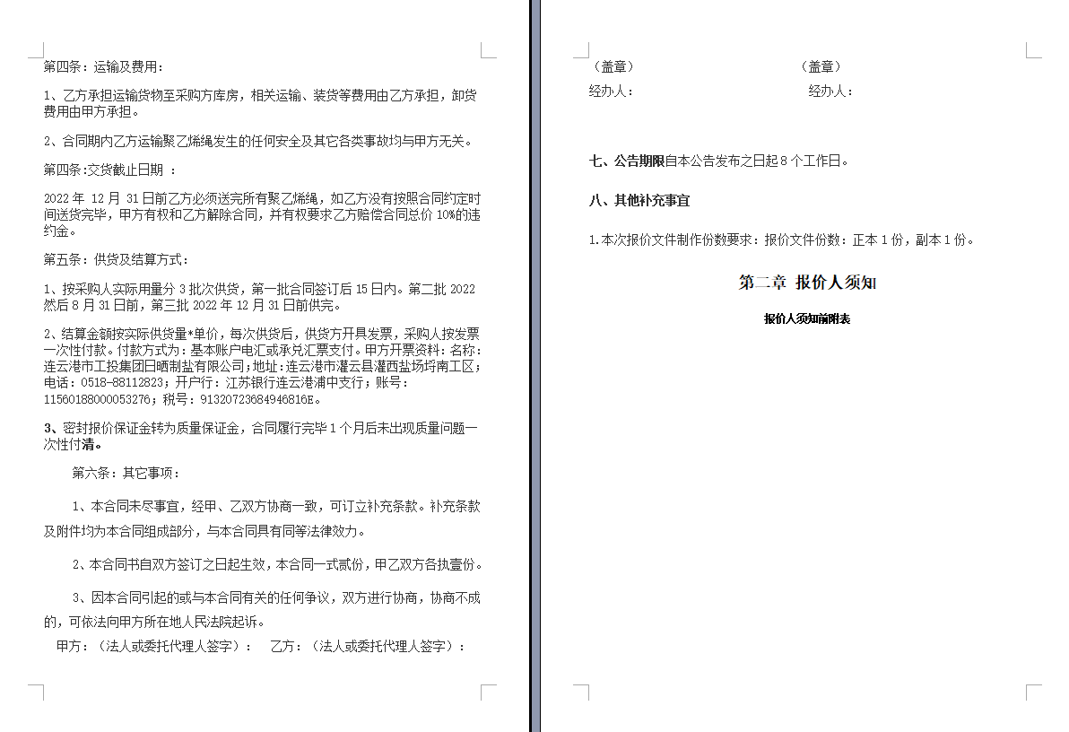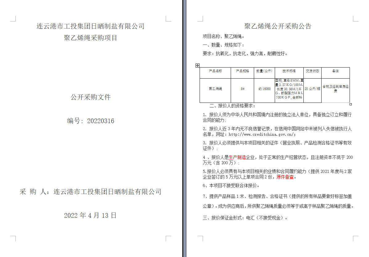 連云港市工投集團(tuán)日曬制鹽有限公司聚乙烯繩采購(gòu)項(xiàng)目