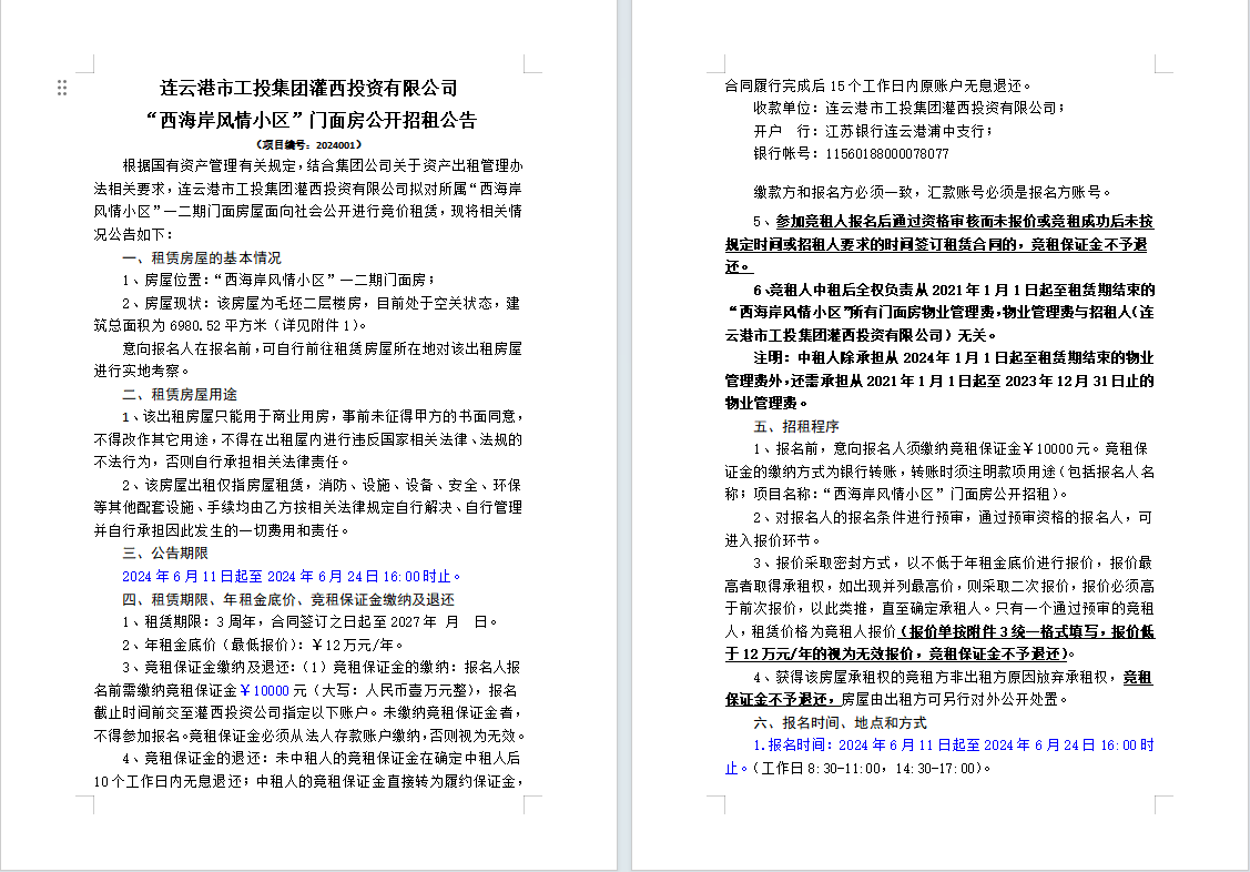連云港市工投集團灌西投資有限公司“西海岸風(fēng)情小區(qū)”門面房公開招租公告