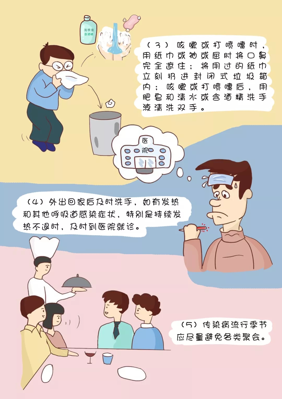 (3)咳嗽或打噴嚏時(shí),用紙巾或袖或屈肘將口鼻完全遮住;將用過(guò)的紙巾立刻扔進(jìn)封閉式垃圾箱內(nèi);咳嗽或打噴嚏后,用肥皂和清水或含酒精洗手液清洗雙手。