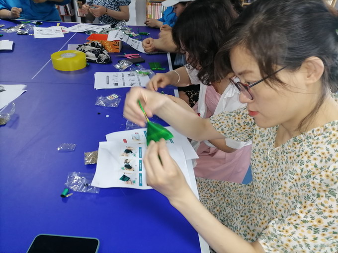 制作香囊時,大家認(rèn)真研究、相互探討,經(jīng)過半個多小時細(xì)心的縫制,一個個神形兼?zhèn)涞摹棒兆印毕隳页尸F(xiàn)在眼前。