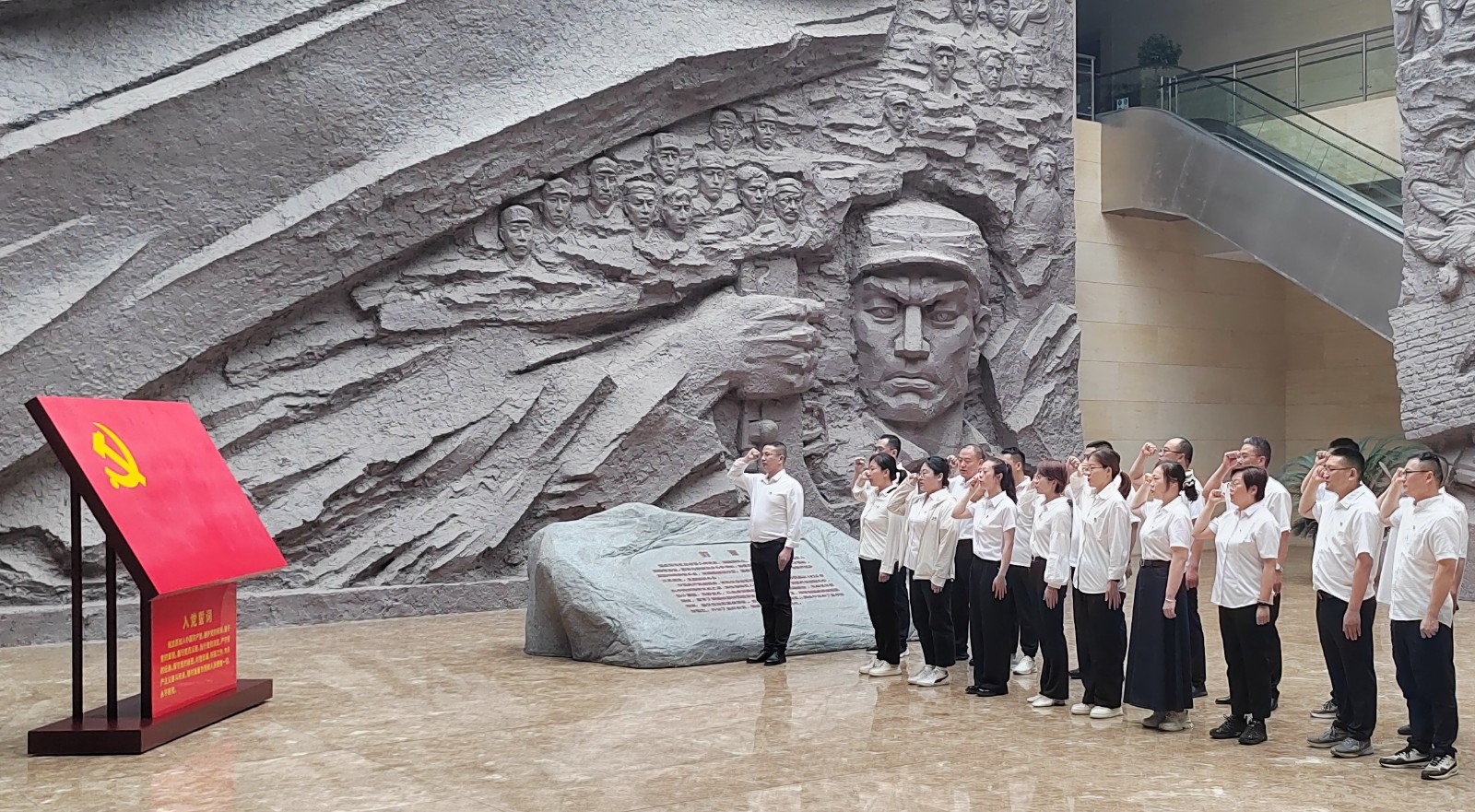 在連云港市革命博物館莊嚴肅穆的展廳內,大家認真聆聽講解員講述連云港地區(qū)的革命斗爭史。一件件珍貴的歷史文物、一幅幅生動的歷史照片,再現了革命先烈們?yōu)槊褡褰夥攀聵I(yè)英勇奮斗的光輝歷程。在革命烈士浮雕前,全體黨員整齊列隊,重溫入黨誓詞,強化政治信仰,增強責任擔當。