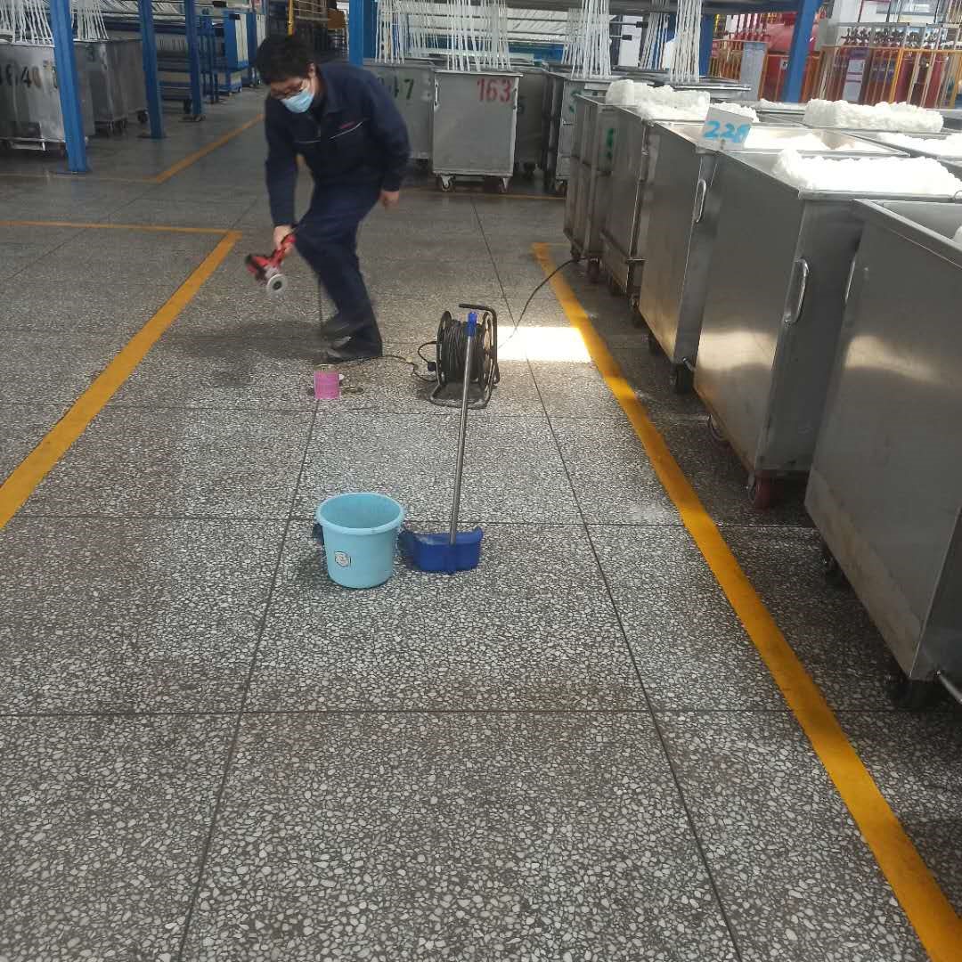 為解決生產(chǎn)車間地表面磨損嚴(yán)重及地表面黑化等問題,4月18日中午,生產(chǎn)車間甲班大班長黨曉峰使用手持式打磨機,對生產(chǎn)車間后紡集束空地小塊區(qū)域,進行了打磨加石板蠟拋光實驗。若實驗效果良好,可進行全車間使用,改善地面油漬黑化現(xiàn)狀,美化生產(chǎn)環(huán)境。