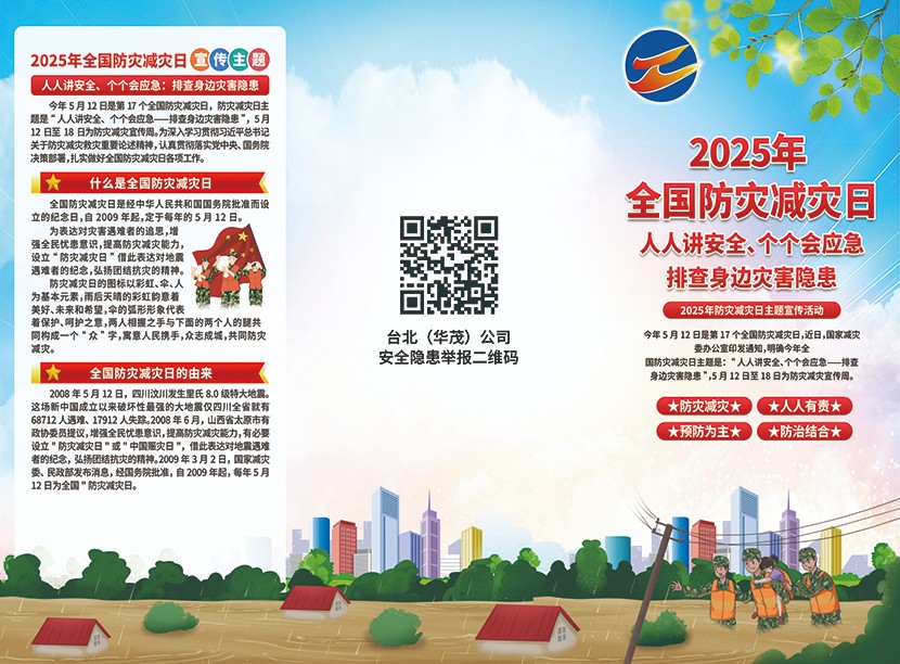 為進一步提升防災減災意識和應急避險自救能力,筑牢安全防線,5月12日下午,臺北(華茂)公司防災減災宣傳周活動啟動儀式在環(huán)保裝備產業(yè)園五樓會議室舉辦。各基層單位分管安全負責人、現(xiàn)場安全員、班組長及安環(huán)部人員參加活動。