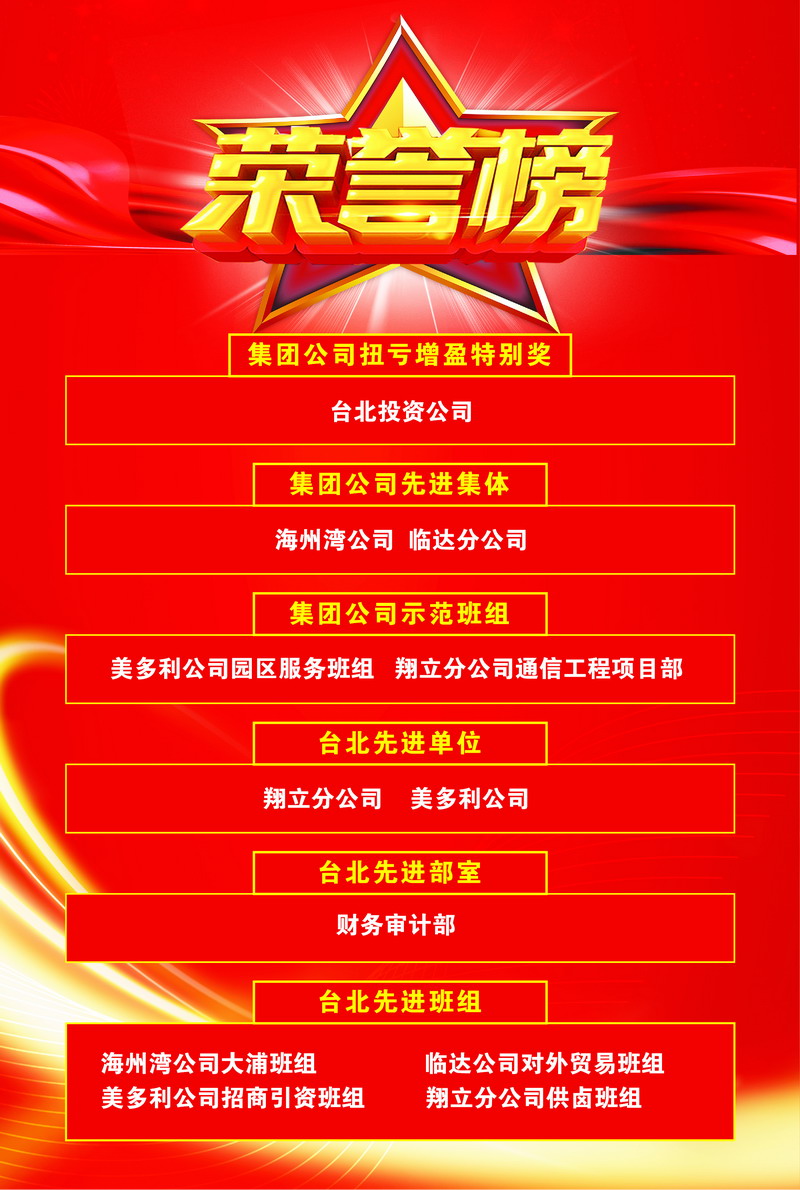 臺(tái)北投資公司連續(xù)兩年被集團(tuán)公司授予“扭虧增盈特別獎(jiǎng)”;海州灣公司、臨達(dá)分公司被評(píng)為先進(jìn)集體;美多利公司園區(qū)服務(wù)班組、翔立分公司通信工程項(xiàng)目部被評(píng)為示范班組;夏軍、趙原塵、袁桂誠、宋文靜被評(píng)為優(yōu)秀員工。