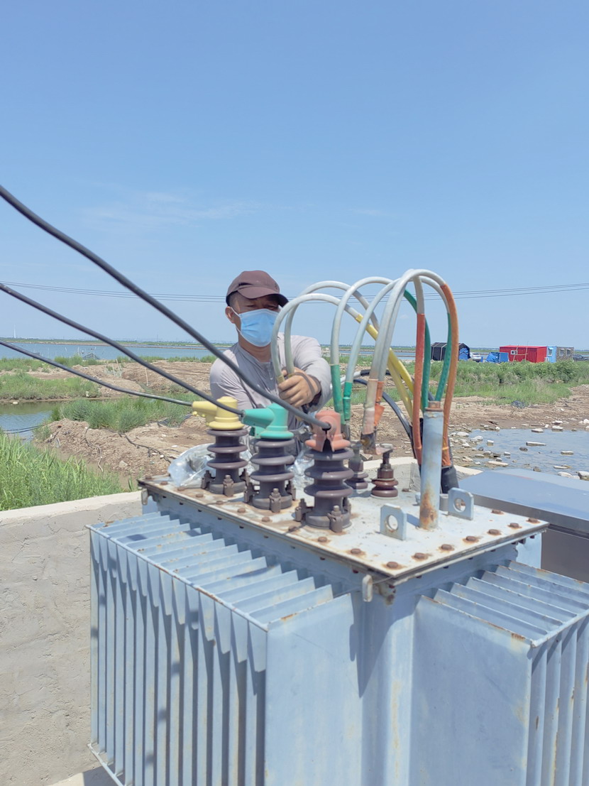 10時(shí)40分搶修工作全面展開(kāi),當(dāng)天地下氣溫接近38度,塔臺(tái)上氣溫接近50度,變壓器上燙的要命,人在上面只是感覺(jué)熱浪滾滾,電工尹永明身上衣服很快被汗水濕透,太陽(yáng)暴曬,如火的驕陽(yáng)絲毫沒(méi)有阻擋施工進(jìn)度,一切工作都進(jìn)行的繁忙有序,井井有條。中午12時(shí)30分經(jīng)過(guò)近2個(gè)小時(shí)的搶修,工作人員完成了變壓器的維修任務(wù),保證了魚塘用電設(shè)備的正常運(yùn)轉(zhuǎn)。