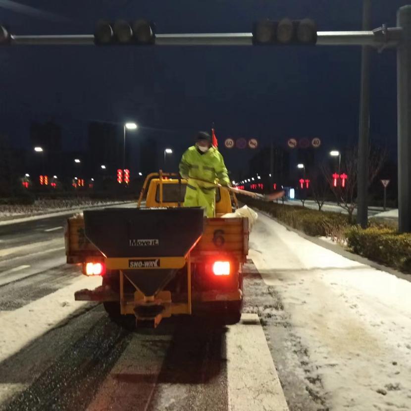 ? ? 一方有難,八方支援。由于本次降雪量大、勢急、持久,單靠環(huán)衛(wèi)分公司無法全面完成任務(wù),在上級領(lǐng)導(dǎo)的統(tǒng)籌考慮下,兄弟單位火速馳援,大綠化、大市政、大采購,大的不僅是業(yè)務(wù)整合,更是人心凝聚,更是集思廣益。翔立、盛達利用鈣液和工程資源優(yōu)勢,通過架設(shè)大型原料桶儲備鈣液水,由3-5輛工具車進行24小時鈣液拋灑,積冰融化速度超出預(yù)期,提升了后期鏟車的工作效率,順利保證了上下班高峰期交通順暢。特別是在2月22日,在兄弟單位的協(xié)助下在清晨8點完成了活動路線保障及市領(lǐng)導(dǎo)掃雪除冰視察。