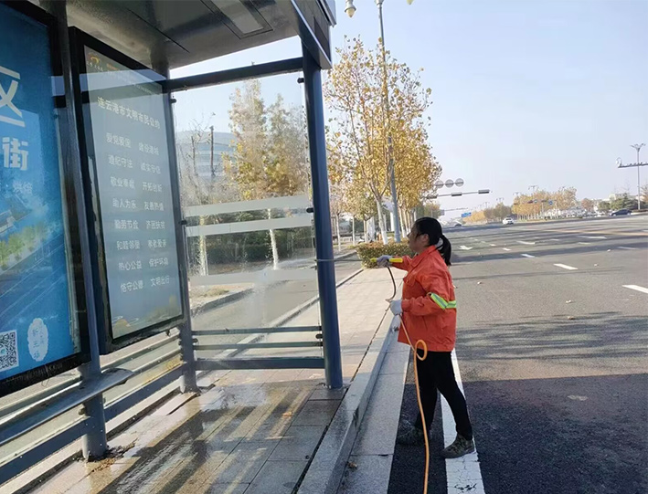 該分公司百余名一線保潔人員,無懼徐圩初冬低溫天氣,道路兩側,公交站臺,三人一組,兩人一對在班長帶動下,揮動手中大掃把,上下擺動拖把,人工清掃輔道落葉2000多米長,清洗站臺30多個,徒手擦洗座椅60多個,清倒果皮箱200多個;突擊轉運園區(qū)施工垃圾300袋,有力保障途經(jīng)道路環(huán)境整潔靚麗;大型車輛整裝待發(fā),持續(xù)三天加班加點,7時許準時加滿車廂用水,安全有序到達指定路段,20臺大中型清掃沖洗車輛作業(yè)臺班達4個以上,為成功完成此次大保障有力彰顯機械強大功能。